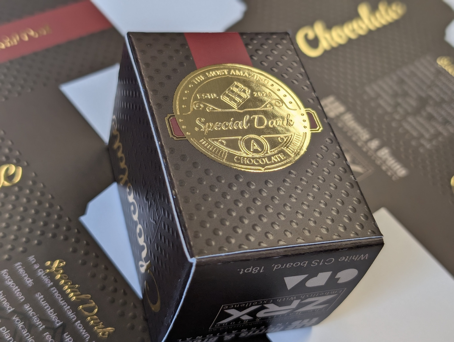In the chocolate packaging case, the base begins with a matte flood coat that creates a foundation and sets the tone for luxury. Gold foil accents bring warmth and brilliance, adding a refined metallic glow that catches the eye. Lastly, a pattern of xMatte, creates an embossed like texture that feels almost carved into the surface.